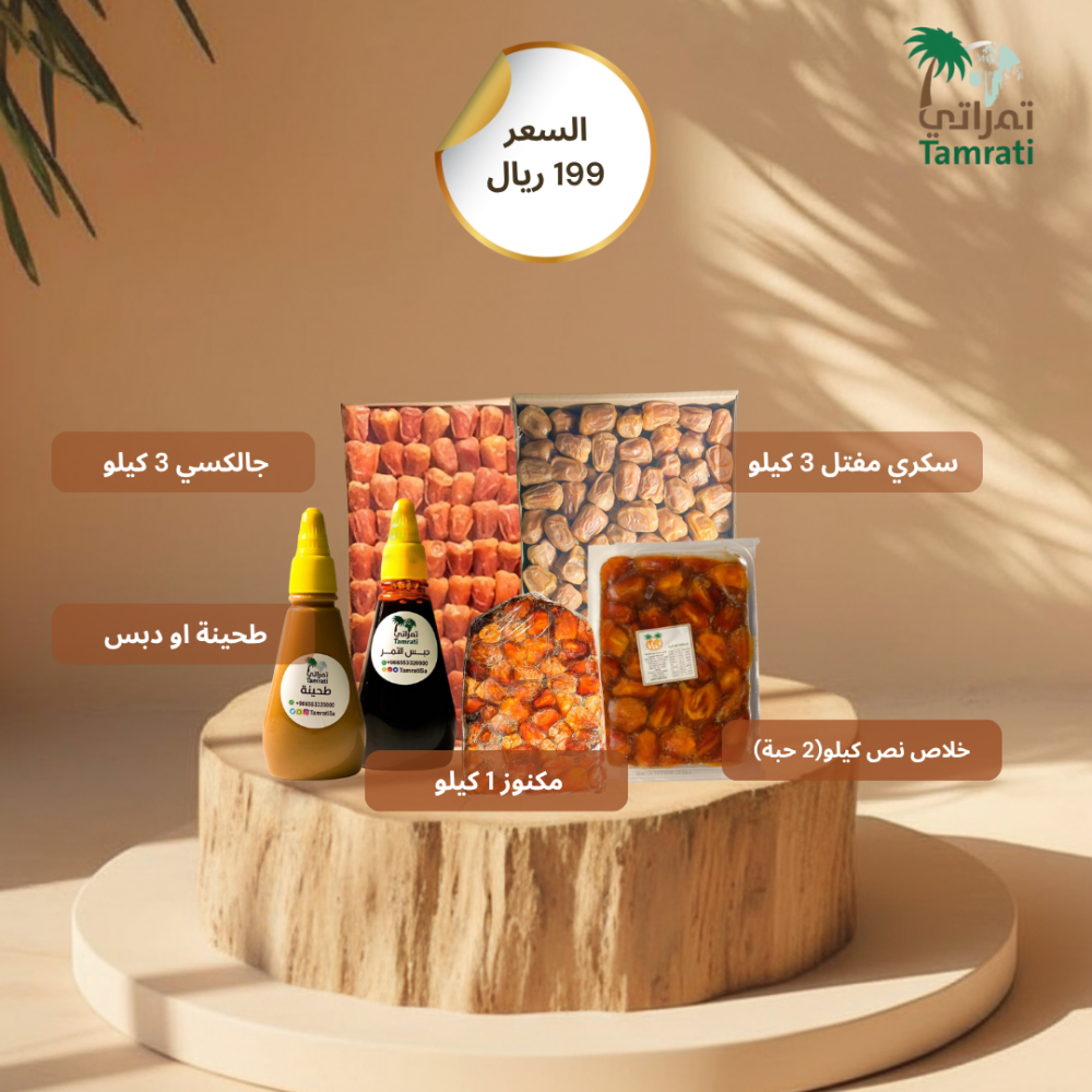 تجربة فاخرة لمحبي التمور بطابع تراثي غني، يتضمن تمر سكري مفتل ملكي 3 كيلو، تمر سكري جالكسي 3 كيلو، 2 عبوة خلاص نصف كيلو، تمر سكري مكنوز 1 كيلو، بالإضافة إلى طحينة سائلة للتمر أو دبس التمر الاصلي.